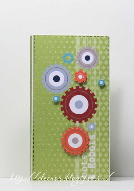 некоторые шестеренки вырезаны из другой бумаги, и приклеены на объемные подушечки, гелевой ручкой прошлась по краешкам бумаги, имитируя ручную строчку )